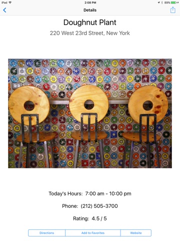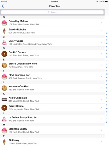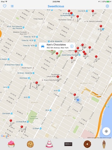 Select a cupcake, cookie, cake, chocolate, donut or ice cream and Sweetlicious will locate these items and display them on an interactive map around your current location. Tap any result to get full details.