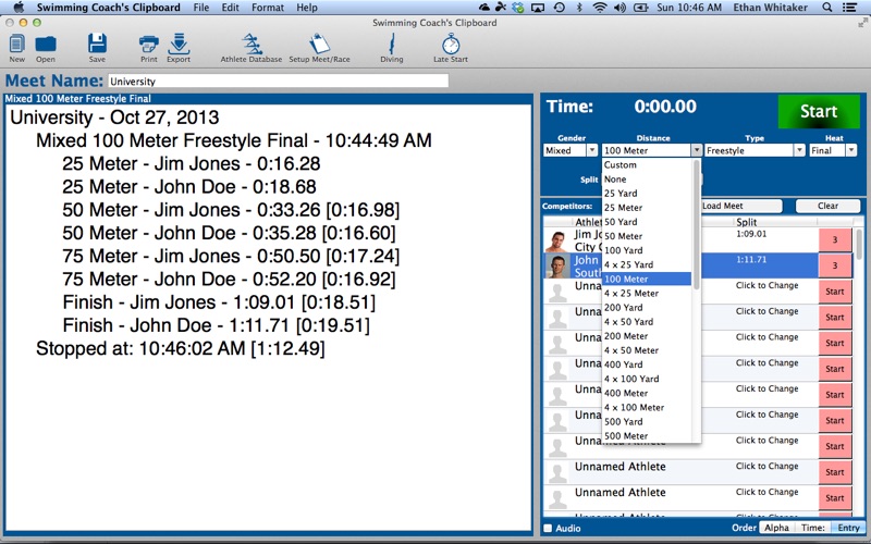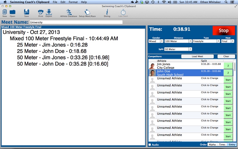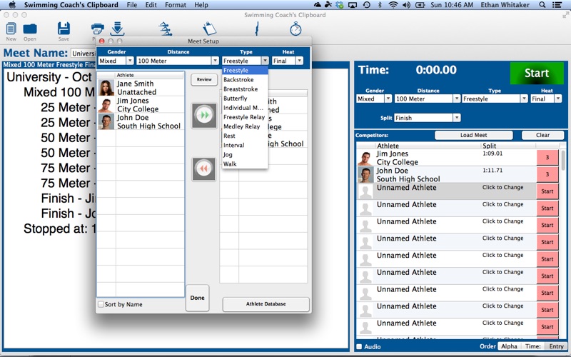 Swimming Coachs Clipboard allows Coaches to setup all swimmers for all events prior to a meet and then load them with a tap of a button.