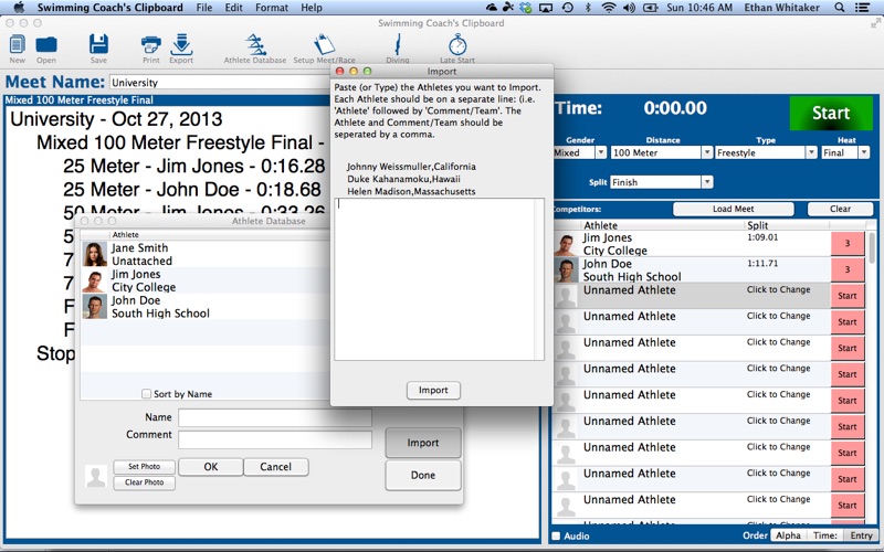 Key in your athletes or import them from a comma delimited list. Attach Photos of your athletes to the database, various timers and events . . . making it easier to identify swimmers and divers during a fast moving meet