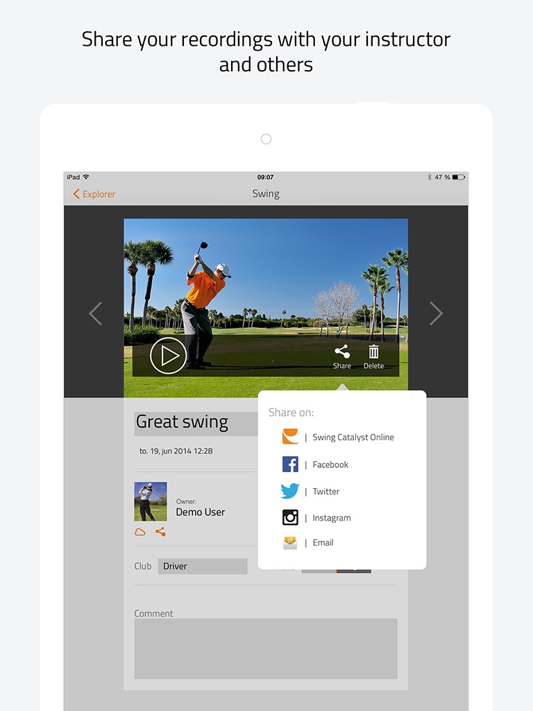 - Share videos with other Swing Catalyst users and instructors