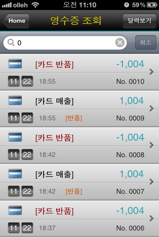 3) 영수증조회 : 출력, 문자, 이메일, 현금영수증, 반품(현금/현금영수증/카드)