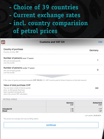 Our App gives you a quick overview what you can bring into Switzerland duty free. A quick ‘Customs & VAT’ calculator at your disposal when you need it most – in the Swiss Customs hall. It calculates VAT for all Euro countries and is especially useful for countries that border Switzerland – namely German, France, Austria and Italy. In total the App covers the 39 most travelled to countries in the world.