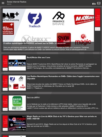 It is a free and fun application, that provides the listeners with an easy way to listen to the Swiss digital radio stations (DAB+, Internet, Digital Cable), see the current on air song, and have special information dedicated to iPhone/iPad users.