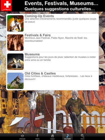DreamsGallery: 120 exclusive photos reflecting the soul of the country through spectacular scenery, unusual pictures, unexpected encounters, surprising details. Selected in the vast photo galleries of the cultural and touristic guide fusions.ch, they are displayed here in a different form, carefully re-trimmed and - for iPad users - much larger than on the website.