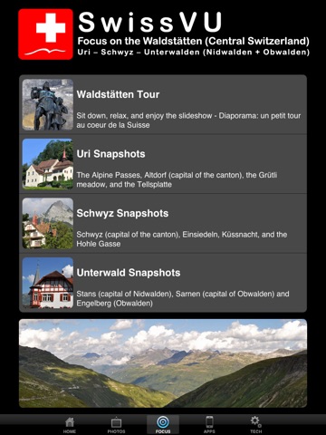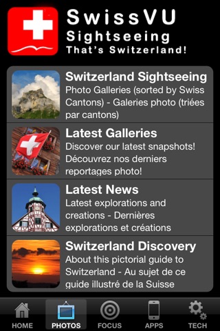From little-known picturesque villages to world famous tourist destinations, along crystal blue lakes and over high Alpine peaks, this app shows you many Swiss highlights, always starting with spectacular and unusual photos, then giving you all basic informations, coordinates, and useful links to official websites.