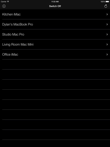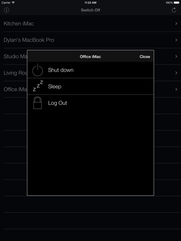 It features a highly intuitive user interface, and requires zero configuration, the only requirements are simply that your Mac (running OS X 10.6 or above) and iOS device (running iOS 4.2 or above) must be connected to the same WiFi network, and your Mac must be running our free Server Software, which is available at http://www.djmdevelopment.co.uk/switchoff.