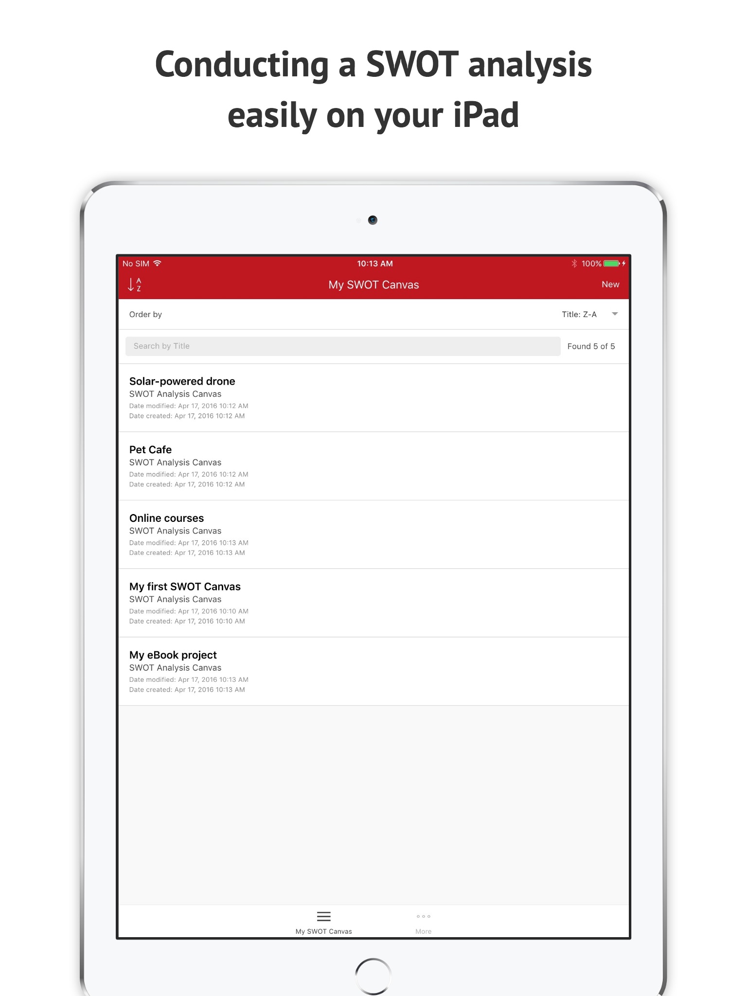 Thiss app lets your create and conduct SWOT analysis effectively on your device. You can also view and export your canvas as PDF .