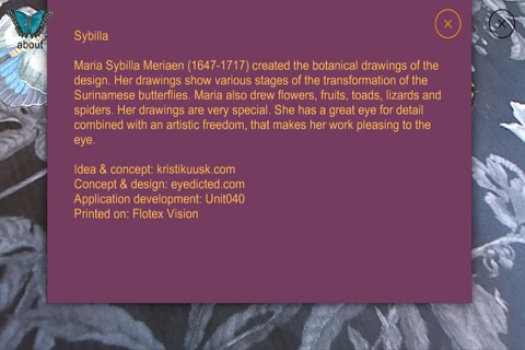 Sybilla uses AR (Augemented Reality) to create a wunderful experience on your carpet. If you have the Flotex Vision - Sybilla carpet you are able to se the wunderful world of flying butterflies. The butterflies are in the 17th century design style of Maria Sybilla Meriaen.