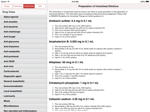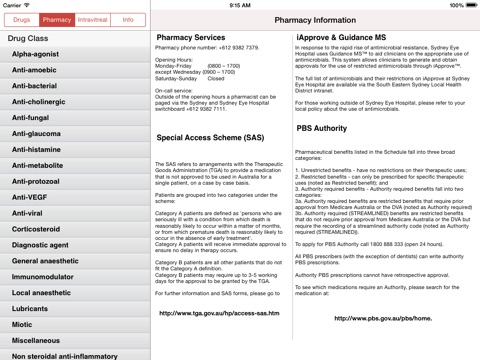 The Sydney Eye Hospital Pharmacopoeia is an application which provides quick and easy access to reference information for medications used in ophthalmic practice. Drugs can be searched by generic or Australian brand name. Each drug entry includes information on indications, dosage, access & availability, special considerations & precautions and adverse reactions & monitoring. A quick access guide to intravitreal drug dilutions is also provided.