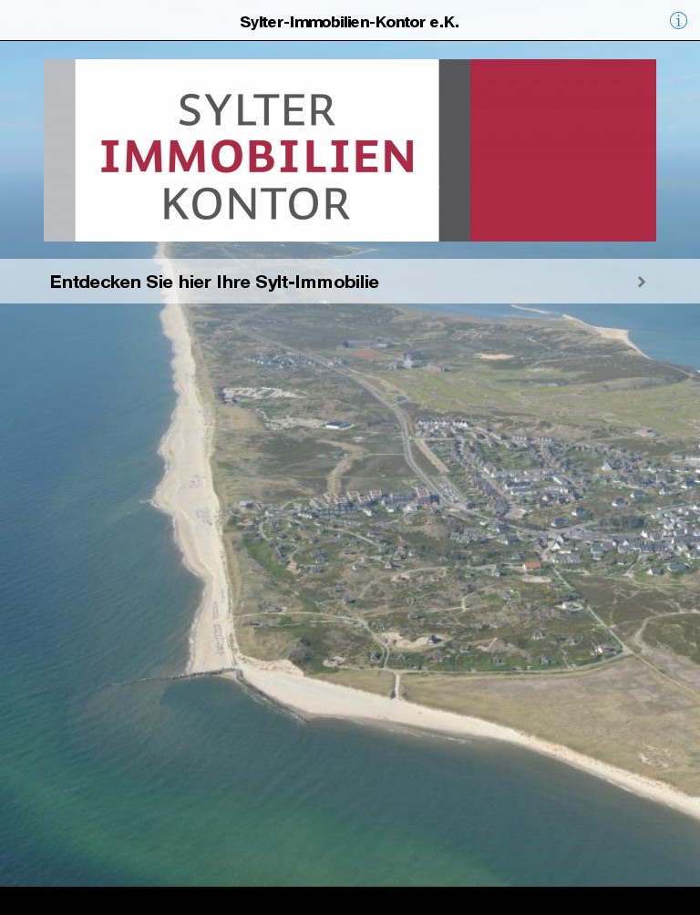 Eine perfekte App, um eine Immobilie auf der Insel Sylt zu finden. Egal ob Sie eine kleine Wohnung suchen oder das exklusive Haus in seltener Lage. Mit dieser App finden Sie das passende Objekt. Sollten Sie hier nicht Ihre Wunschimmobilie finden, dann nehmen Sie bitte Kontakt mit uns auf.