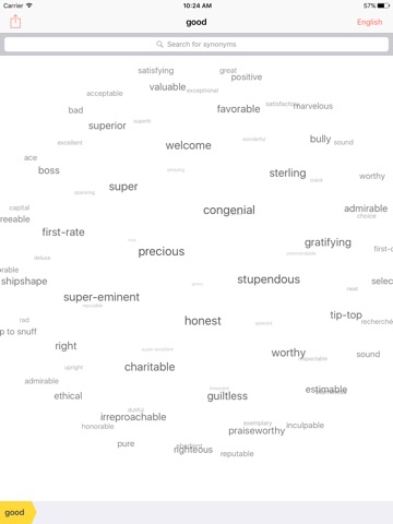 Our thesaurus app stands out thanks to its Interactive Word Cloud Interface — a visual representation of synonyms and related terms that you can easily explore with just a tap or swipe. Instead of scrolling through static lists, immerse yourself in a dynamic, interconnected web of words.