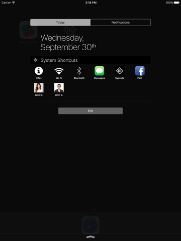 Syscuts - as in System Shortcuts - allows you to create settings and contacts shortcuts right into your Today center!