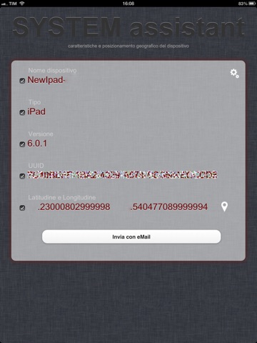 Visualizzazione e trasmissione, via eMail e/o SMS, delle caratteristiche del dispositivo e della posizione geografica.