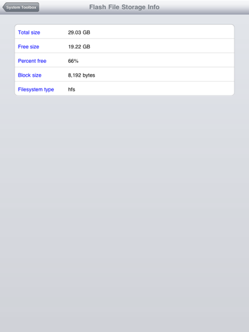 - Displays total, free, percent free, block size, and file system type for the Flash storage for your programs, music, and data.