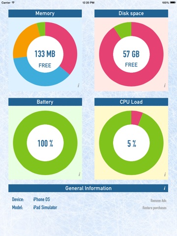 System Tools App has simple and elegant interface to monitor memory use, network status, cpu use, disk space and battery charge.
