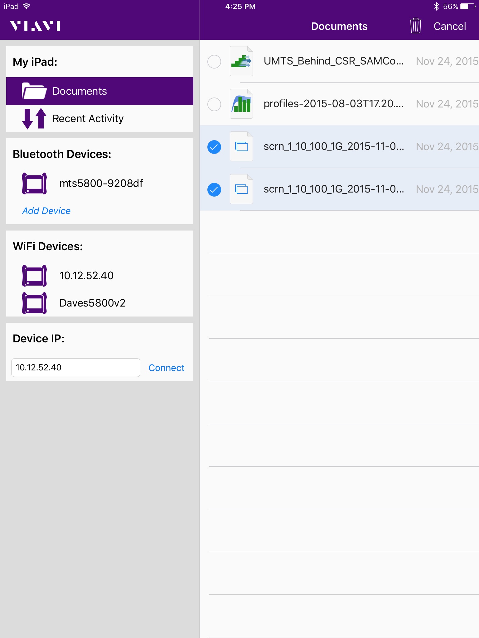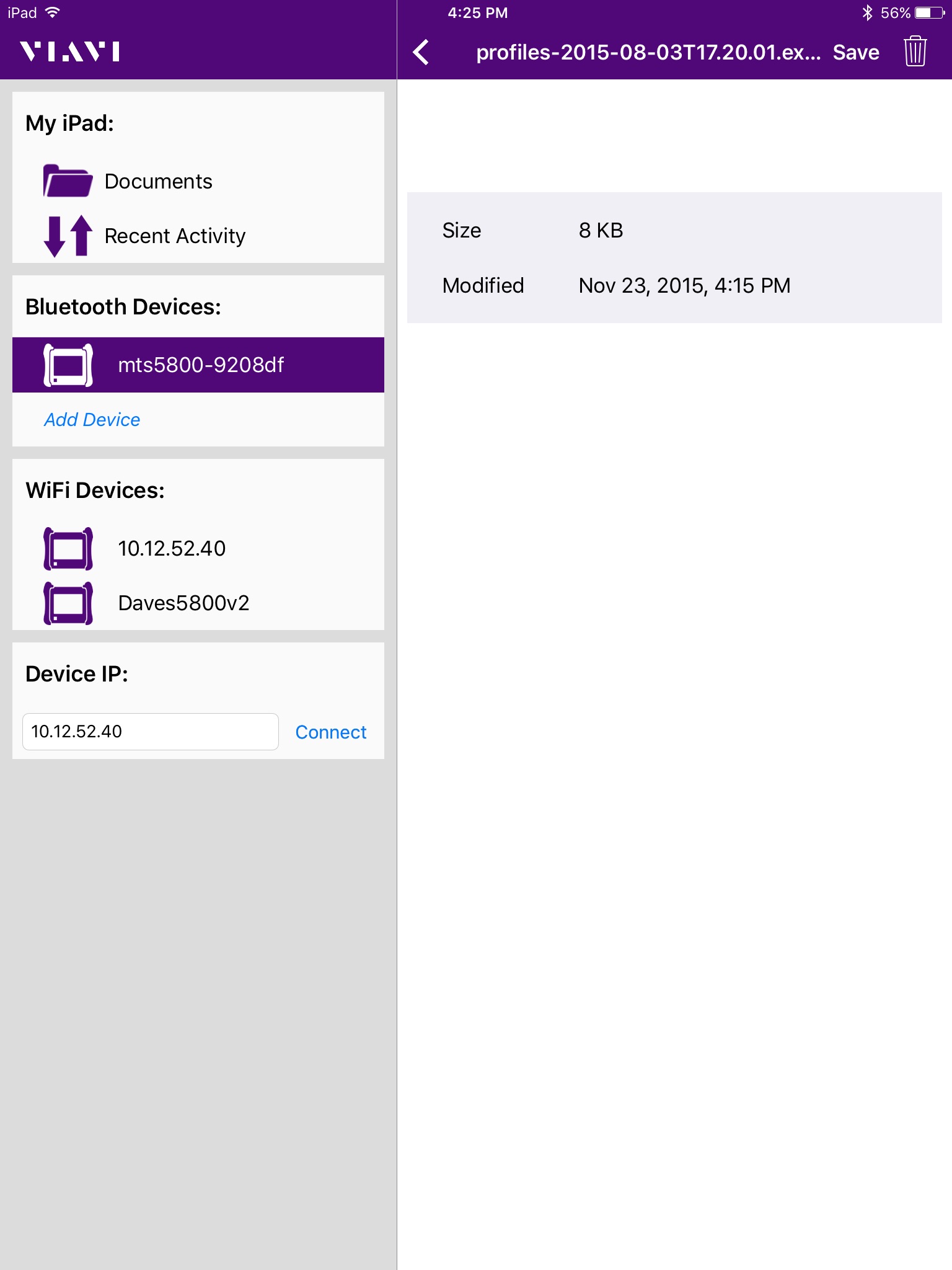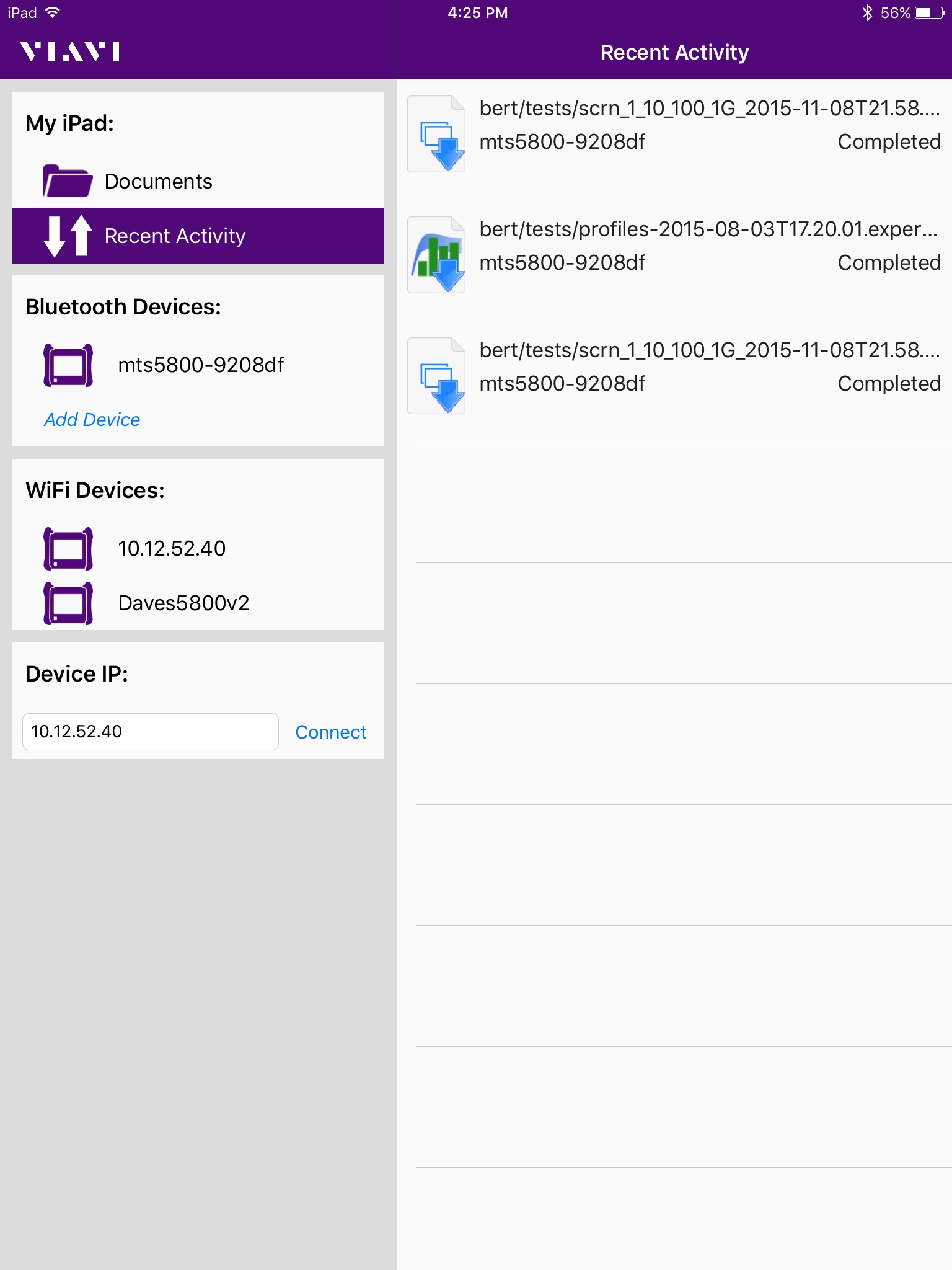 Transfer test configuration and test report files between your T-BERD/MTS-5800 and iPhone/iPad via either Wi-Fi or Bluetooth.