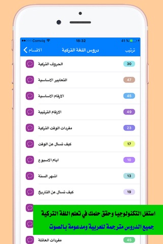البرنامج يحتوي على عدد هائل من الكلمات والعبارات التركية والتي هي الاهم لبناء اساس قوي وصحيح في هذه اللغة العالمية والاكثر استخدام في الحياة اليومية