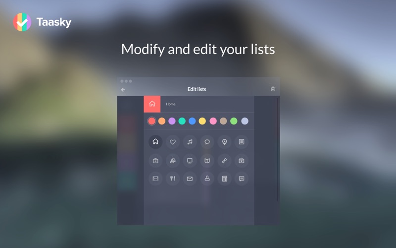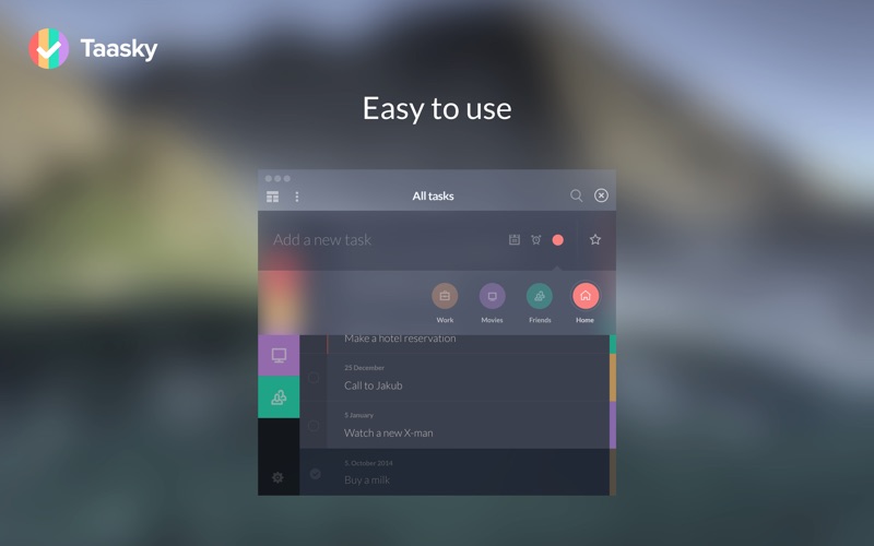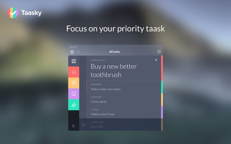 Taasky is the most beautiful task manager for Mac yet. It provides innovative features, unique and visually appealing design. Thanks to the priority task that you set you can truly focus on whats most important. Taasky features editable colored lists so youll never get lost and always have everything under control. Completely revamped effects and award-winning design offer an incredibly simple interface thats entertaining and fun to use.