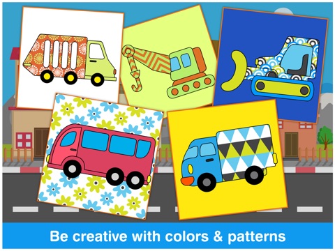 Tabbydo invites child to fun and amazing trucks & vehicles color book which will help them paint with 35 colors and 10 beautiful patterns. Kids will discover 26 type of vehicles like Tow trucks, Fire engines, Monster trucks, Diggers, Garbage trucks, Rollers, Crane and other construction site vehicles.