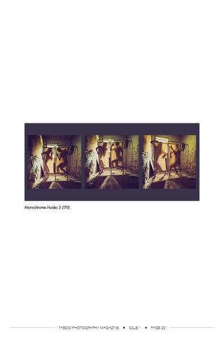 Taboo is a new contemporary, edgy magazine with beautiful, nude, sexy, gorgeous women that have an edge to them. Whether theyre outside, in abandoned warehouses, in color, in black and white, or monochrome, Taboos edgy art style is a treat for all.