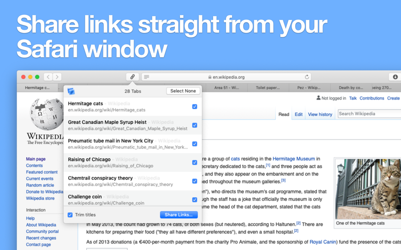 Tabs to Links detects open pages and can trim repeated text from the end of the titles automatically. Frequently, websites append their site name to the end of a page title. Trim titles detects this repetition automatically and strips it when sharing the links.