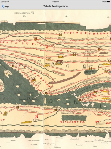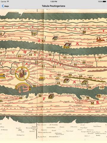 The Tabula Peutingeriana, also anglicized as Peutingers Tabula and the Peutinger Table, is an illustrated itinerarium (road map) showing the cursus publicus, the road network in the Roman Empire. It is kept at the Austrian National Library in Vienna and now is in your pocket with incredible zoom. The original map upon which it is based probably dates to the 4th or 5th century and was itself based on a map prepared by Agrippa during the reign of the emperor Augustus. The present map is a 13th-century copy and covers Europe (without Spain or the British Isles), North Africa, and parts of Asia (the Middle East, Persia, India).