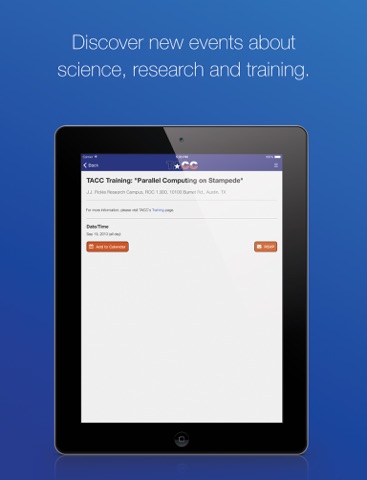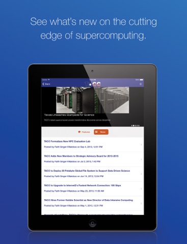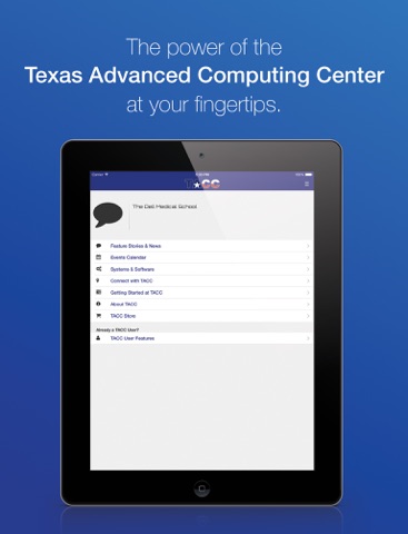 TACC Mobile is an application interface to the Texas Advanced Computing Centers services,systems and expertise. It is designed to inform society about the value of advanced computing in everyday life, while also providing powerful features to help registered users better use TACC resources. The app brings the advanced computing power of TACC directly to you wherever you go!