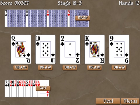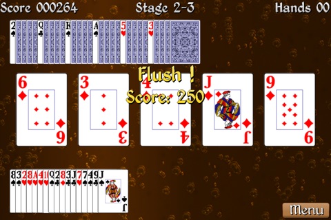 Challenge yourself in this unique variation of the classical five-card draw Poker game, where a normal deck of 52 cards is played consecutively in 5 rounds of poker hands, you can see which cards have been played after each round, helping you to figure out the odds for the next cards to come and which possible wining hand can be made. Additionally you can recover a few of the played cards, or discard some the cards to come to increase your chances of winning. How far can you win and how much can you score ?.. A perfect game for poker and solitaire lovers!
