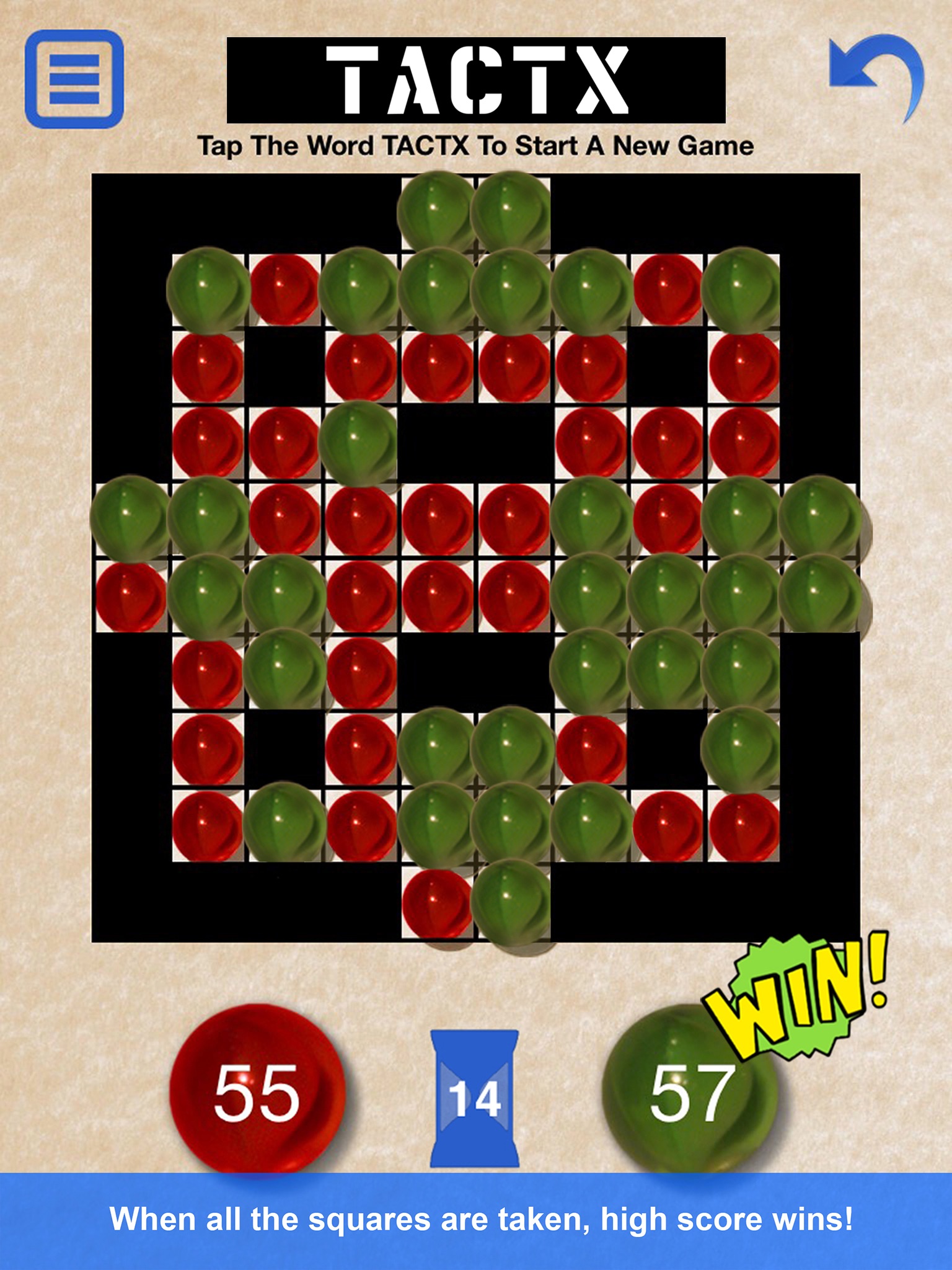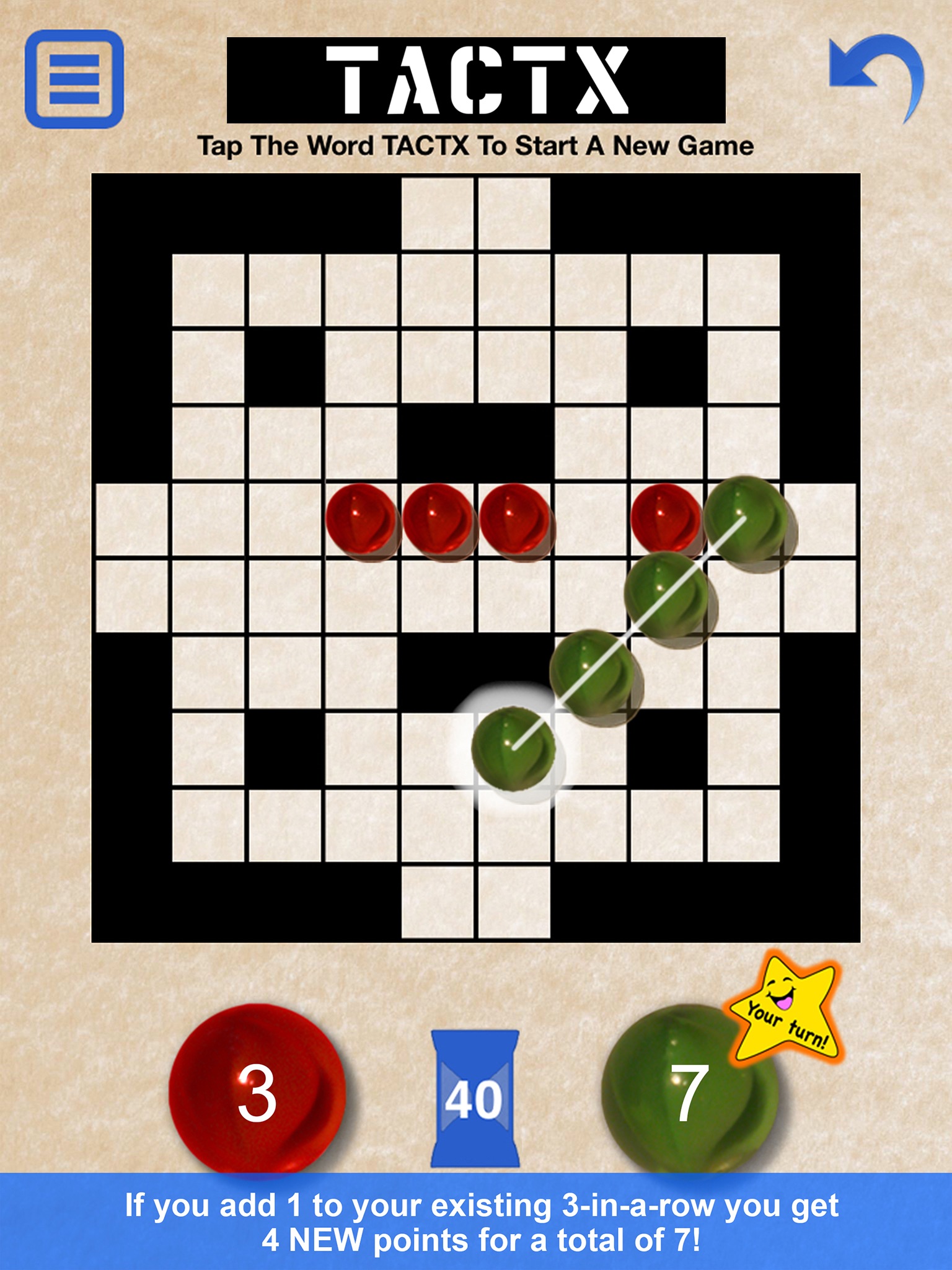 TACTX is like Tic-Tac-Toe on steroids. Its a strategy game that starts out simply but gets complex fast. 3 in a row vertically, diagonally or horizontally earns you 3 points BUT the game doesnt stop there. Add to your lines to get many more points.