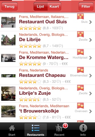 * Filteren en sorteren op oa. keuken, prijs, waardering, afstand, ontbijt/lunch/diner