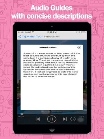 - Interactive step by step audio tour of key sights at the Taj Mahal