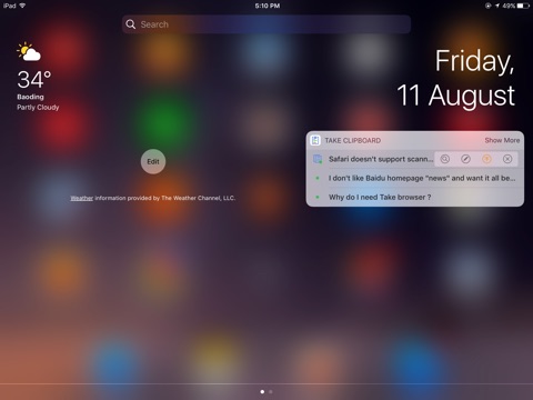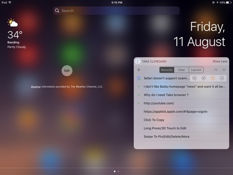Take Clipboard store general pasteboard string and provide convenience way to copy and edit in App and Today Widget.