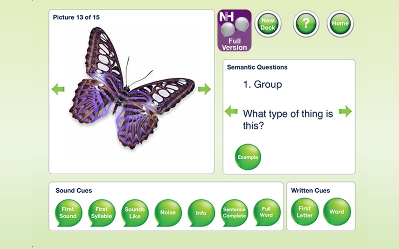 At the start you will see a picture that you should try to name. You will also see six questions about the semantic features of the object and a button that gives you an example. In addition there is a set of cues to help you to find the word, including the first syllable of the word and a sentence to complete by using that word.
