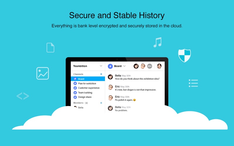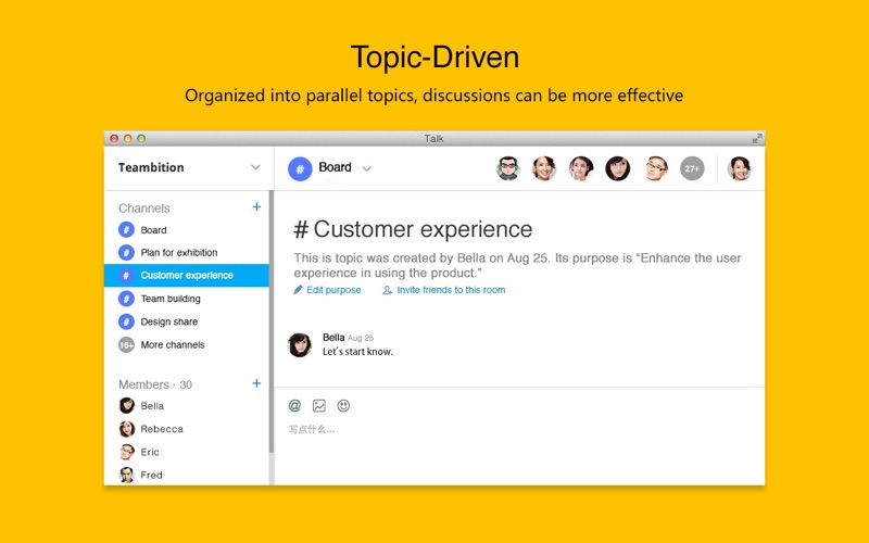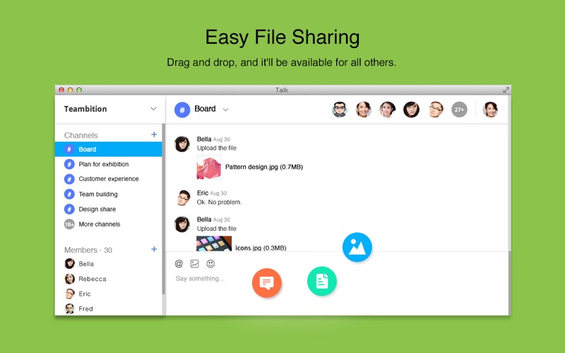 Talk.ai is the next generation IM developed by Teambition. It can help you organize your teams communication,taks,files and other stuff around their topics, in a Slack-like way.