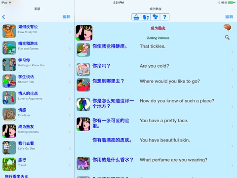 • More than 45 categories, including 6 travel sections, falling in and out of love, arguing, small talk and many others