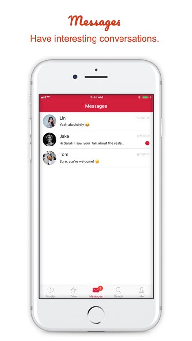 Swiping through interests makes it easy to find topics you already like or to discover something new. Follow topics to see what people talk about and dive right in the action. You can create a Talk yourself or comment Talks of others. If you find someone with common interests, start chatting instantly right in the app.
