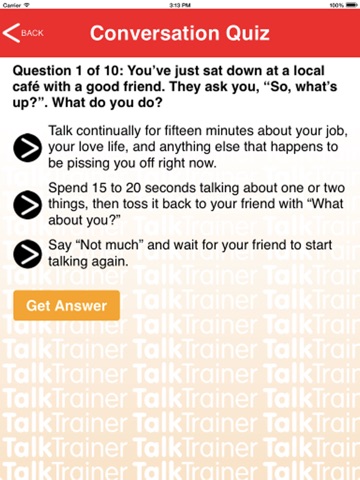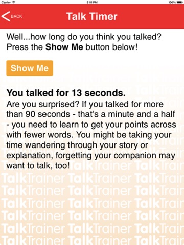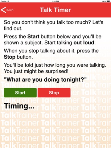 Want to be better at conversing? Give TalkTrainer a try! TalkTrainer has tools and advice that you can use to practice talking on your own, including a talk timer and a quiz on conversational concepts. If youre shy or want to better converse with others, TalkTrainer is a free and easy way to learn.