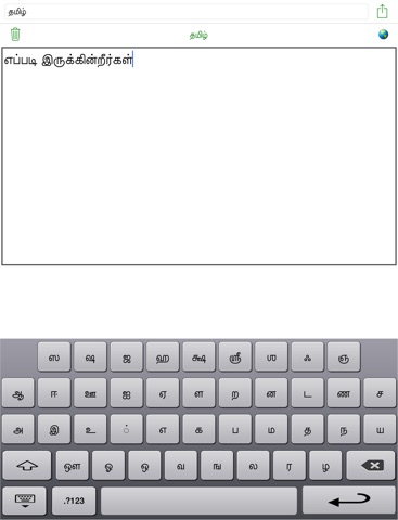 - switch between the custom Tamil keyboard and any iPhone keyboard (for example, if you want to type an email address in the middle of a Tamil message)