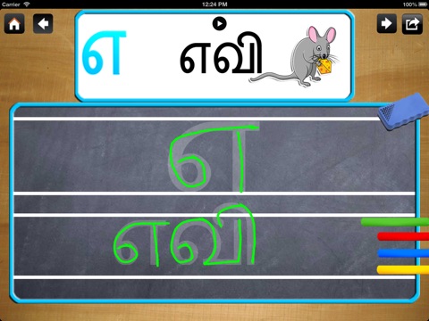 Each letter is associated with a character and in each page you can touch the character. Tamil alphabet has a proper order, but to learn to write there is an alternative sequence so kids dont get frustrated.