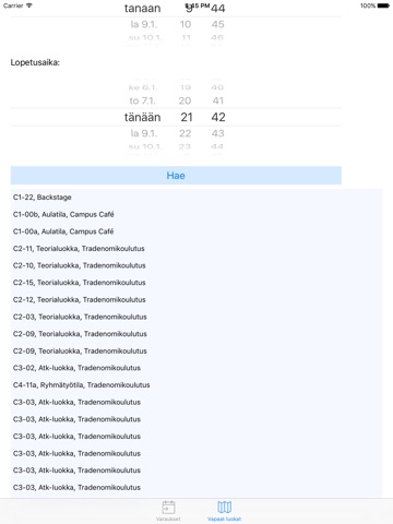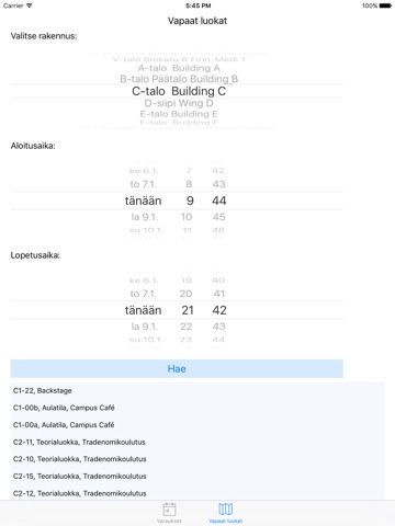 TAMK Class Helper searches all the available classrooms for you. You only have to choose the building and time range. It also shows you all the reservations in a certain classroom.