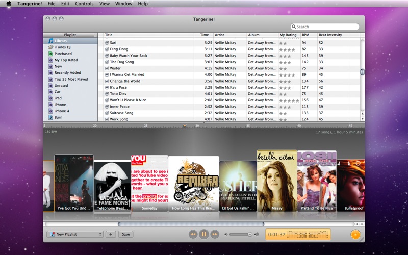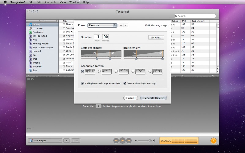 Tangerine! lets you easily create playlists of upbeat music, or playlists for relaxing. It works by analyzing the BPM and the beat intensity of your music. Spend your time listening to music, not making playlists.