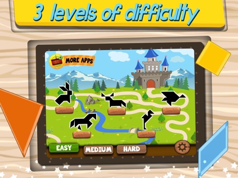 - Easy level: just move the shapes into the hinted spots, no need for rotating. Suitable for 3 years old and under