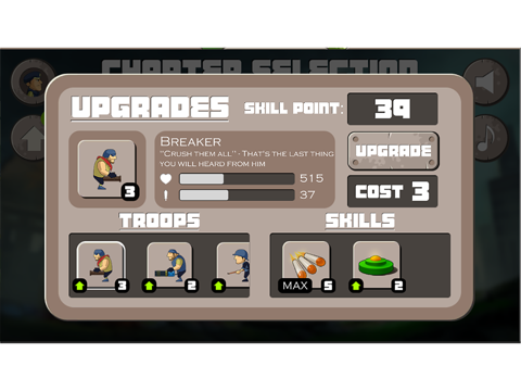 - Spend skill points to upgrade troops and skills.