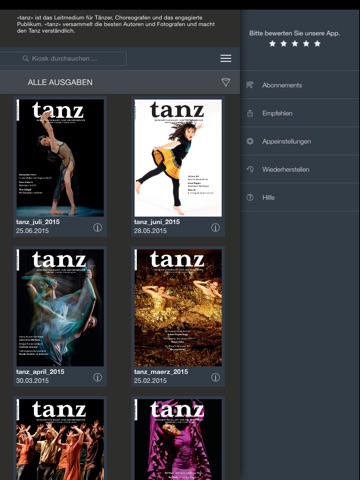 Lesen Sie "tanz", die wichtigste Lektüre für Tänzer, Choreografen und das tanzaffine Publikum, jetzt auch auf dem iPad. Jeden Monat neu finden Sie hier die besten Autoren und Fotografen, die den Tanz wie in der gedruckten Ausgabe spannend und verständlich in Wort und Bild übersetzen. Sie finden wie in der gedruckten Ausgabe die für den Monat wichtigen und aktuellen Rezensionen, Portraits, Interviews und Reportagen sowie alle wichtigen Tanztermine in ganz Europa. Die "tanz"-App bietet darüber hinaus Videos und Bildergalerien sowie Links zu allen Veranstaltungen im Terminkalender. Sie können sich per Lesezeichen wichtige Termine oder Texte markieren. Und vor allem: Sie empfangen und lesen die "tanz"-App überall, auch unterwegs auf Ihrer Tournee oder auf Ihren Reisen.