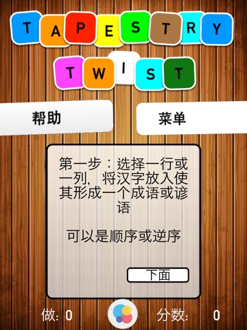 Tapestry Twist 字谜游戏开始时会有部分文字出现在格子上。然后将提供的文字移动到格子里并确保在此文字在它所占行和列内不能出现两次,还要确保在每个带边框的区域内同一个文字不能出现两次,同时任意行或列还有带边框的区域内的所有文字都能组成提供那个字谜