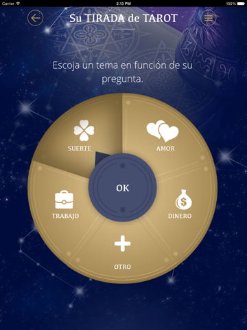 Al hacer clic en Su Tirada del Tarot tendrá acceso inmediato a su futuro en uno de los siguientes ámbitos: ¡Amor, Trabajo, Dinero, Azar!
