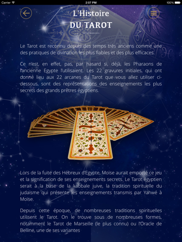 Profitez, à votre tour, des enseignements immémoriaux des Tarots, même sans avoir de connaissance en la matière et d’un simple clic. En cliquant sur Votre Tirage de Tarot, vous aurez accès immédiatement à votre avenir dans un des domaines suivants : Amour, Travail, Argent, Chance !