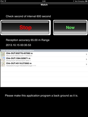 TargetWatch (target watch) is an application program that sends the third party the warning mail when iPhones acquiring the location information with GPS on the back ground, and the time that entered in a specific area and going out outside the area.