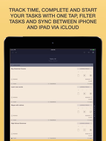 When you create the new event, you can run/stop it and check/uncheck its completed state in one tap on the Events screen. You can track time spent on every event and task.
