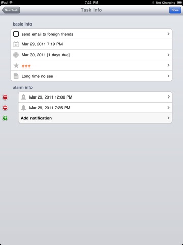 you can write a task item with details (a memo, a due date, alarms and a star mark).